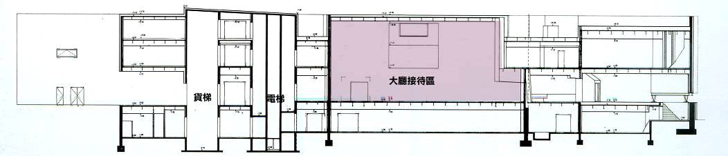 長向剖面 - 通過入口的斜坡及廁所等服務空間