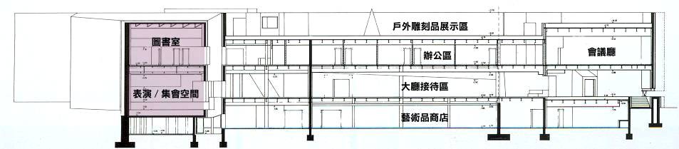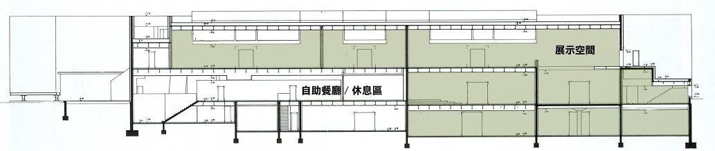 長向剖面 - 地面層包含自助餐廳及休息區,還有永久展示區(permanent exhibition rooms)、短期展區(temporary galleries)