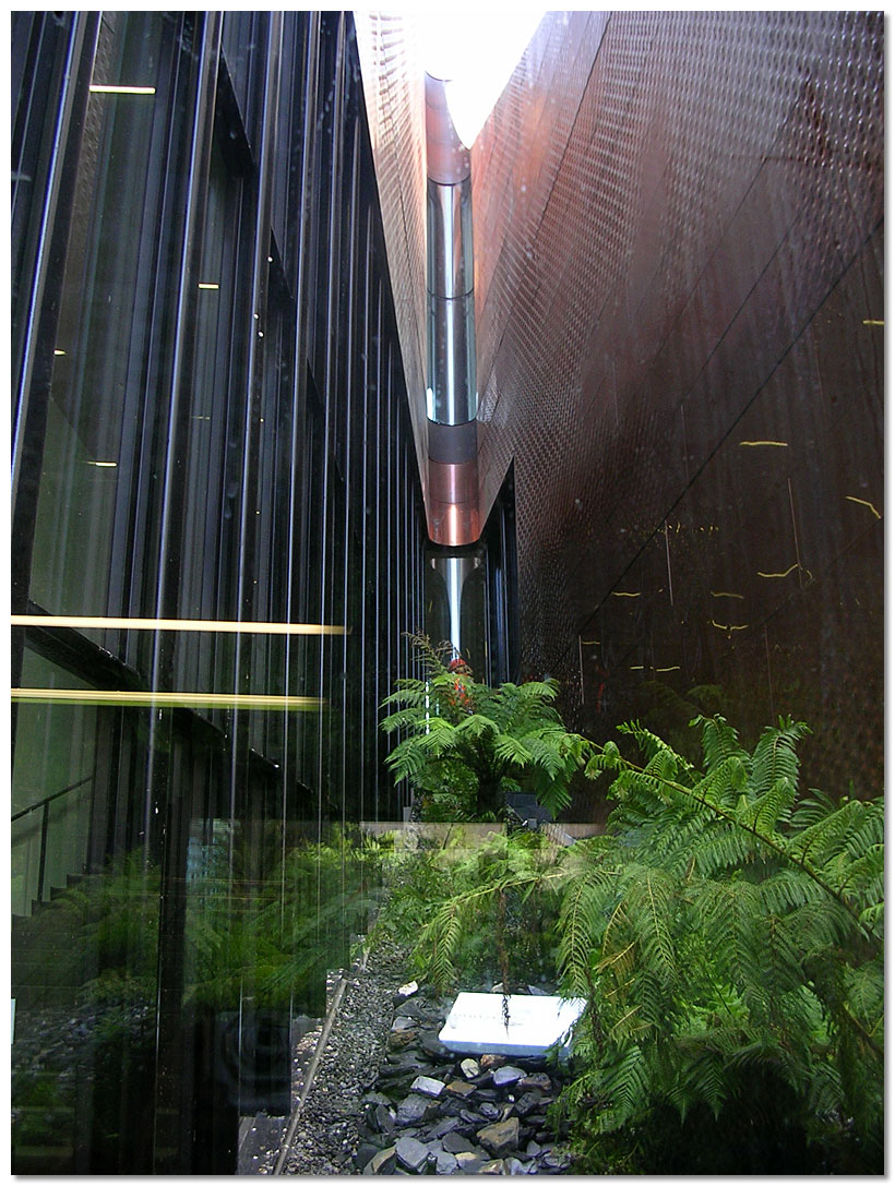 (2)量體交錯形成的中庭空間引進了公園的綠色植物, 並在建築立面皮層上運用了凹凸