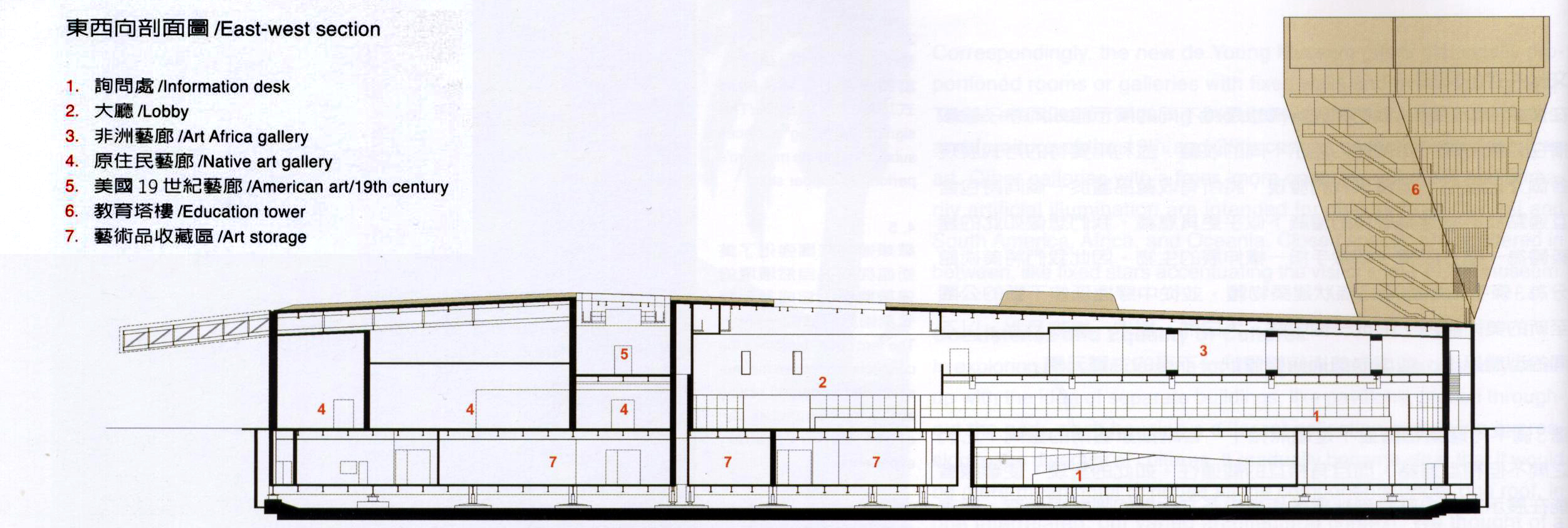 (1)三條量體相互交錯形成主要的美術館空間, 一樓1/3面積為免費對外開放的展覽活動