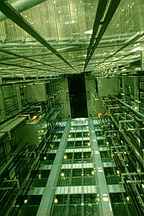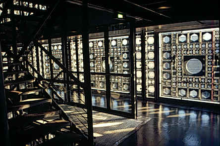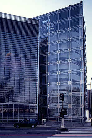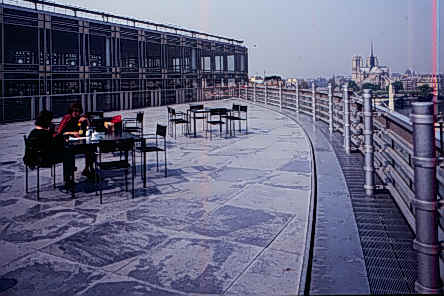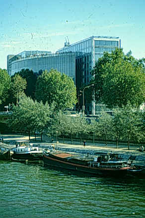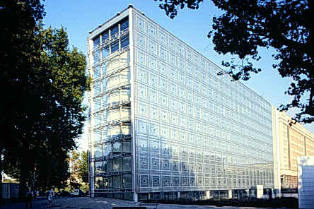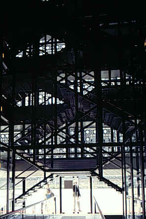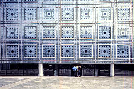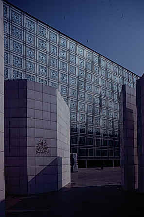 阿拉伯世界中心是我在巴黎刻苦之行最後幾天的建築體驗之一,當我從聖路易島的Pontdu Sully橋往阿拉世界中心進行時在橋上我幾乎已見到它的風采,而其因本身位於佔盡所有地利條件的基地使的其能在塞納河邊具有引人注目的視覺效果且因它的二種不同幾何形狀組合在整個都市中扮演非常重要的角色,在整個都市角度來看,阿拉世界中心從塞納河來看當然也成為一個焦點中心,這是由於我們的一次在塞納河尚搭船遊行時的目光焦點所致。而在它的南向立面上是由27000個類似照相機快門的鋁質伸縮式百葉,其功能是可依照戶外溫度來調整遮陽的裝置而這些當然是由電腦來控制日光的傳送,這樣由鋼骨、玻璃、鋁質材料加入高科技的建築設計出現在Jean Nouvel的作品上當然是無可厚非,而他這種利用高科技的設計方法是對傳統的阿拉伯格柵裝飾的一種詮釋,由此亦建立了與阿拉伯文化的關連性。在展覽室內,光線扮演著非常重要的角色,光線穿過南面的活動光圈而閃閃發光或盤繞在圖書館的螺旋飾物上,使南面具有阿拉伯精神的標誌;因此在陰暗與明亮之間對於塞納河和聖路易(Saint-Louis)島的環境限制下成功地克服了艱難;即是把一種紀念性建築物納入巴黎宏大遠景中的艱難性。從它的屋頂上望塞納河觀看亦是一覽無遺,從屋頂上下來時我走在這些鋼板的樓梯踏板時深深地感覺到深處在高科技建築中的感覺,且對那所謂能對日光做調解和傳送的照相機快門鋁質百葉仔細觀察一番在如此多的單元去結合整個建築本身來達成其設計理念、北向立面運用運用轉化的手法來象徵建築與歷史性城市的關係、運用攝影的手法使倒影呈現在玻璃面上這些均是努維爾在此設計案中非常成功之處。