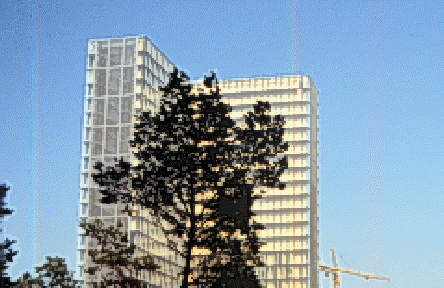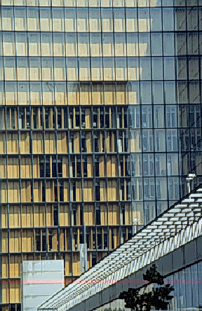 Perrault在此案中,深信建築物應該被設計為一個巨大的、且具有整合地形的、清楚明顯的建築物。承續先前的想法,他計畫將圖書館設計成象徵四本站立的書籍,利用此對稱性且高100公尺的建築量體,圍塑10782平方公尺中有250棵樹木的中庭花園。當然接踵而來的,Perrault也面臨一些政治上的動盪,反對者批評他的計畫與都市景觀的衝突性,藉著彼此的溝通與協調,使得原設計100公尺的主體建築物被迫降為80公尺,而將部份的藏書放置於地下室。 作品介紹: 入口: 這個對稱性的結構建築物,由於形式上的單純,所以可以很明確的領導新舊讀者進入此建築物的中心(中庭花園),並沿著通往平台與花園的戶外斜坡道進入主要服務門聽。 此圖書館中包含工作空間、視聽音響設備、閱讀空間….等等,值得一提的是環繞在花園周圍的,專業人員的研究空間,此空間也因為中庭挖空近3層的高度,使得採光計畫在此閱讀空間獲得解決。在Perrault想法中,設計一個閱讀的場所,包含整個閱讀的行為都必須整體考量,所以除了希望可以避免吵雜而趨近安靜之外,對書籍資料的處理上,也希望可以避免繁雜的搜索過程,而趨近於自動化的處理,並且配合著專業的服務設施(運輸系統)。因此規畫一套內部的服務系統,於底層與高塔間來回運作,圖書由專門的管理部門負責管理,分工使得內部的管理工作更符合專業的制度。主體建築物表皮由不反射的玻璃與金屬的材料(黃銅、白鋁、以及鍍鋅)所組成,小心的保護著內部的藏書與避免過強的日光損毀書籍等等。此建築物內提供近5000個閱讀區,以及更多額外的服務設施,預期將來每天可服務近20000的社會大眾。 將此圖書館與城堡作一比較,在於建築師將它處理成透明的容器狀,這玻璃與金屬的組合帶來了建築物的透明感,同時,這玻璃的外殼與整體的形式,也帶來類似飛彈發射台的威嚴感。 一個意象方正的圖書館,是由4個座落在角落的高塔所組成,這個方正的平行六面體,每個高約80公尺凸出巴黎市中心天際線的建築物,隱含著某種知識性權威的象徵性與紀念性意義外,不但成為巴黎市中心的心地標,也已經成為人們心目中的地標,留下不可抹滅的印象。一個更耐久的、經的起時代考驗的、並充滿時代意義的新建築物。 此圖書館整棟建築物基本上是對稱的,一般民眾可自由的進入的部份,只限於東側與北側的大廳,若是要進入閱讀的話,必須付費購得一張門票。在內部軟體方面,有將近四千個閱覽的空間,開放於一般大眾者大約有1600個位置,其餘留給研究員使用。另外基於安全上的考量,在圖書館內部還有一個消防站,編制60的消防隊員,其中包含有6人是屬於全天候的待命。 此新國家圖書館算是舊有國家圖書館的擴建,在這個新的圖書館,目前收藏的比較新的書,一直到現在還持續在購買新書中,預計要達到35萬冊左右。另外尚有一些手抄本、卡片、與舊有的資料,目前都還存於舊館,預計還要搬過來一千一百萬冊書,每天大略可搬三萬多本書,必須要搬到87年6月份為止,才會完全結束。 以藏書量來說,位居全世界第二,僅次於華盛頓D.C的國會圖書館,總造價大約是70億法郎,50億是主體建築物、20億是裝修的費用,為了以後營運,大概一年還要要十億法郎左右。 圖書館所使用的木板,是採用來自於東非某個國家的特殊的原木,那是一個天然且質地非常好的木材,厚度非常的薄只有一公釐左右,大約四棵樹木就可以做一整棟的國家圖書館,也因為它非常的薄,利用類似夾板的方式進行裝修,所以中間必須夾其他材質。此木質地板一共有四種,第一種是戶外的地板,第二種是圖書館主體建物的地板,第三種是門聽室內裝修的地板,第四種則是運用在演講聽中,比較淡褐色的地板。建築師事實上就是利用這些顏色不同的木板,還有大量的玻璃,以及鋼模版拆除後的清水混凝土,另外還有一種類似編織後的鋼材,這四種不同的材料作為主要的搭配。另外必須談及的一點是此編織的鋼材是建築師一次無意間發現於航空上的材料,設計運用在此棟建築物中,有多種不同的織法,此編織的鋼材除了質感外,還有一些音響上的特殊效果,所以特別適用於視聽室。視聽室的大廳使用木板,主要是遮陽用的,因為在大廳內,不需要太多的陽光。另外此圖書館的地毯,也是遠自非洲剛果來的。 在此棟建築物中,閱覽室分為兩種,一種是一般閱覽室,在一般閱覽室中,有不同主題的書供閱讀,另外一種則是專業閱讀室,像這樣一個比較專業的閱讀空間,希望提供研究人員作研究之用。最底層的空間是研究人員的空間,周邊將是未來可以接受研究人員查詢的服務空間,研究人員若要使用本研究室的話,必須要先預約。在專業閱覽室中,我們可以看有一個長30公尺的鋼材,從內部天花上方,懸掛一直經過圓軸然後垂直下來,在我們上方,有一隔一隔的空間,研究人員可長期在此租一個位置。 其中的家具設計也是建築師自己設計的,閱讀式的燈光不會過熱、為了考慮保護眼睛,採取漸進的光線設計,每張桌面都有插頭,可以連接電腦,而書桌上都編有號碼與顯示燈,如果號碼紅燈是亮著,表示有人預約,如果號碼綠燈亮著表示有人幫妳找到書了,自己是不能去找書的,為此我們提供預約的服務,讀者可以先打電話來預約書,所以當讀者出現的時候,桌子與書都準備好了。 運輸過程: 接著我們參觀的是比較內部服務性的技術方面,這是一個完全自