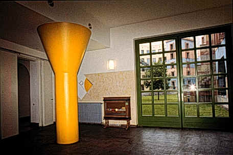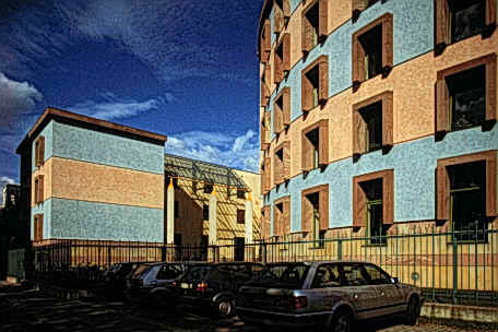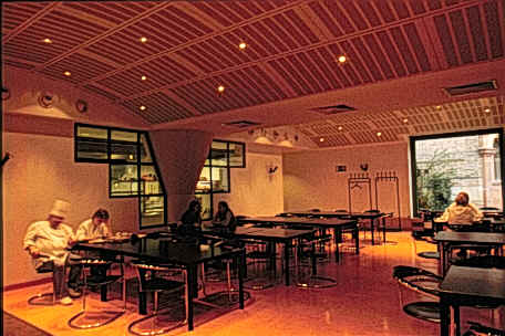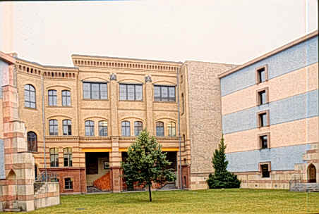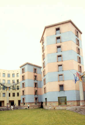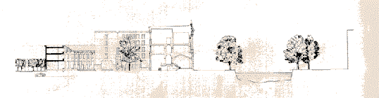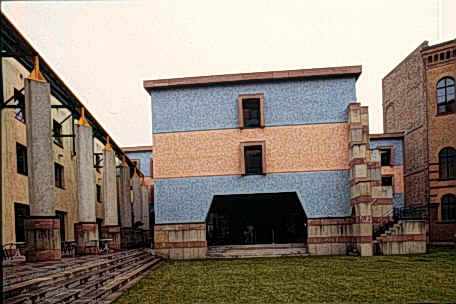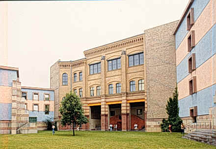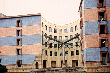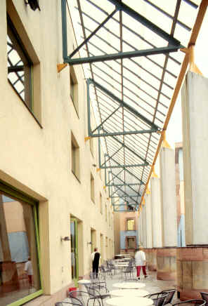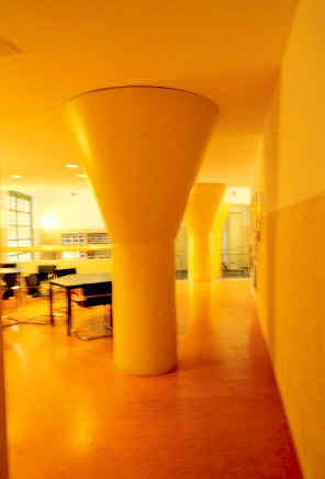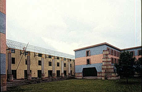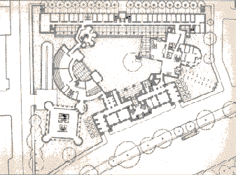 新建築圍繞著一個非正式並有一棵刻意保留老樹在中央的中庭,在地面層可以由走廊及其他樓層的拱廊中俯瞰這個中庭,且與在管理學會一樓的自助餐聽和在社會學會一樓的會議空間產生密切關係,而停車場設置於環境學會的地下層,自由獨立於中庭花園中的塔樓則是圖書館和閱覽室,在高度上成為基地的地標,而在地面層並有良好的花園景觀,在多棟建築物間以一非正式的花園做聯繫,所希望創造的是一個良好的交流空間。