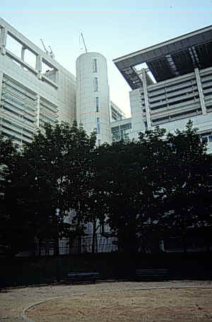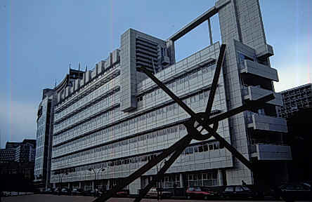 所有辦公室在面對河的西向側,整棟建築物朝向公園的面是由外伸窗格形成表層。三個主要區劃是順應著都市景觀,東側的基本型和量體主要由四個樓層的視聽工作室所決定,夾在東西兩翼之間是三層的挑空、線性的天光,所形成的玻璃大廳,提供穿越工作室的服務空間。