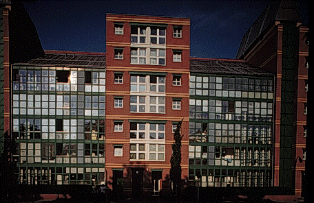 重建的地區位於街廓的中央,這個中央地帶其構思為綠地邊緣的開放空間,將視野延伸到內庭,使它成為公共藝術展現的場所,街廓的邊緣沿著街道植栽,地面居住空間則塑造為提供駐留的柱廊空間。 環境之重整---立面與造型