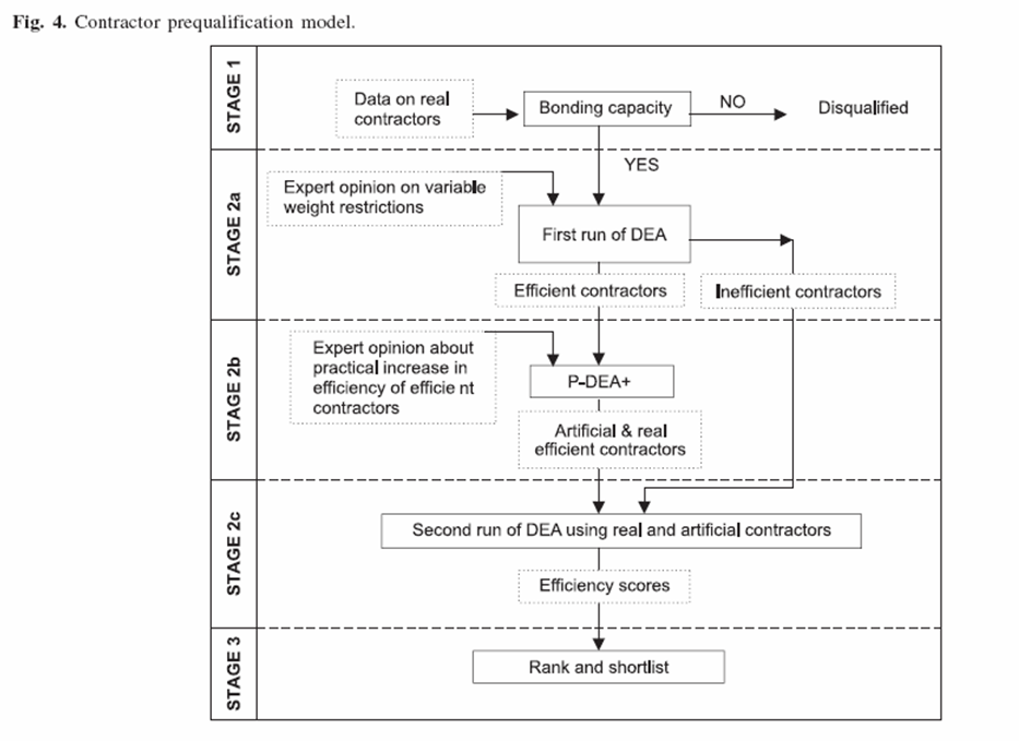 ¥Ø«e¨Ï¥Î¤è¦¡ (CPM¬[ºc(contractor prequalification )³Ì¦¥ÑRamani(2000)´£¥X¡ATran(2002)×§ïÂÇ¥ÑDEA¤ÀªR´î¤Ö¤Hªº°¾¨£«Øºc¤T¶¥¬q:¡C a. bonding capacity³sµ²¯à¤O¡A¬°³Ì«nªº¼f¬d¶¥¬q¡A¦ý«D©w¶qÅܶq¡C b. DEA and DEA run µû¦ô®Ä²v±o¤À¡C c. short-listing ¦C¥X¦X®æ¦W³æ¡C ¦ýì¼Ò«¬¦³¥|Ó¯ÊÂI