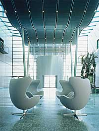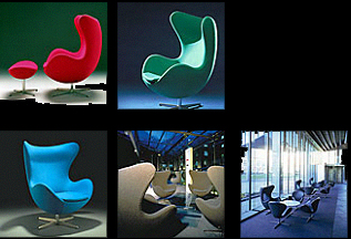 The Egg 蛋椅- 型號 3316 號 (1957) 和天鵝椅 -(1957) 皆以織物 或皮革包覆 , 鋪 上泡沫墊子,玻璃纖維鑄成的椅 座外殼架 在以鋁合金為基座的旋轉座。鬆軟的椅墊則為蛋椅 專屬。 兩者皆在一九五八年由丹麥的Fritz Hansen製造而問世。 這兩個原創設計的椅子都是為了在北歐航空玻璃航廈及皇 家飯 店的建築案而設計的(1956-60)。 他不僅設計了建築物,內部和 家具 , 就連照明設備,地毯,餐具,門把,時鐘, 檯燈和甚至如 陶瓷煙灰缸也如紀念品般地在禮品店中零售 - 完成了如此細節 及優雅的設計。 |