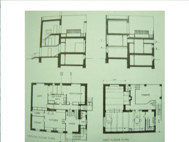 1923年,威尼斯海灘別墅計畫案,上兩圖為橫剖,下兩圖左為地面層平面、又為二樓平面圖。