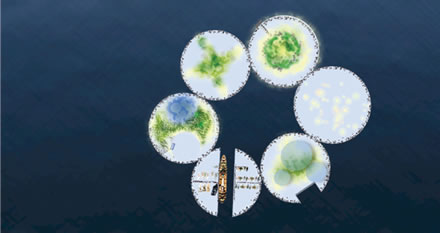 The "floating island" is not a ship. It begins with the