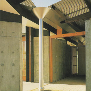 大廳區以及廚房區的屋頂面之間以金屬落水盤連接,落水盤下部以木框架支撐,落水盤兩端以接地的金屬管收集儲藏於地下的雨水,為Murcutt常用的處理手法 |