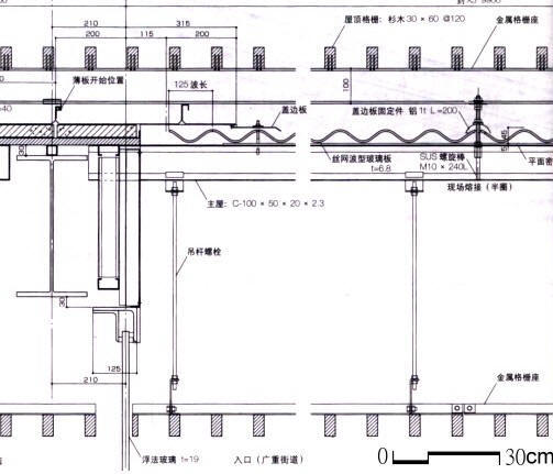 安藤廣重美術館最讓人印象深刻的是入口處具有自明性的屋頂構築形式,透過半透明的波浪狀玻璃屋頂可以清楚的看見隈研吾的多層性屋頂構造,中間是主要的鋼構架系統,鋼構架系統的上方是一層半透明的玻璃材料,在鋼構架上又架上了一層支撐著屋頂垂直狀木質百葉的框架系統,在鋼構架下方以金屬構件吊掛另一層木質百葉。這個入口處的屋頂構造很清楚的讓人看清楚鋼構造框架系統與表面材料的關係與節點(articulations)處理,但就構築性的觀點而言,隈研吾並沒有在細部上作出具有發展性的處理,類似的鋼質框架式的結構配合木質百葉的細部處理手法其實相對於其他著重細部的鋼結構建築作品而言是低技術而且原始的作法,隈研吾曾言及馬頭町是一個完全異質於一般都會型美術館的鄉鎮型美術館,他認為通常日本美術館都有相同的特色,那就是使用混凝土牆與昂貴的材料,如大理石等,這樣的材料在馬頭町反而顯得突兀與不正當。隈研吾試圖從建築的地域性出發,說明馬頭町不適合出現都市型的精細材料處理,但從隈研吾近設計過的建築案來看,他除了1995年在日本靜岡縣熱海市的玻璃住宅案中針對樓梯與天橋作出特殊的高技術結構性玻璃的嘗試,其他的建築案多數是低技術性的細部處理。