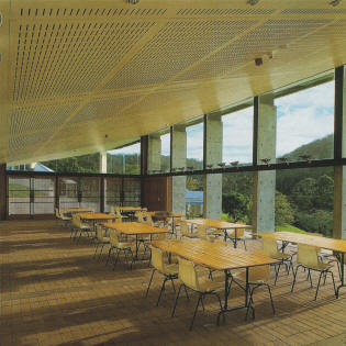 室內短向跨距9米,長向跨距18米,由南側的一道清水混凝土承重牆,以及6組清水混凝土柱子為主要結構,混凝土上承接鋼構件,在與其上的屋頂結構相接 |