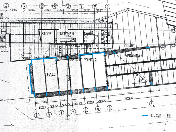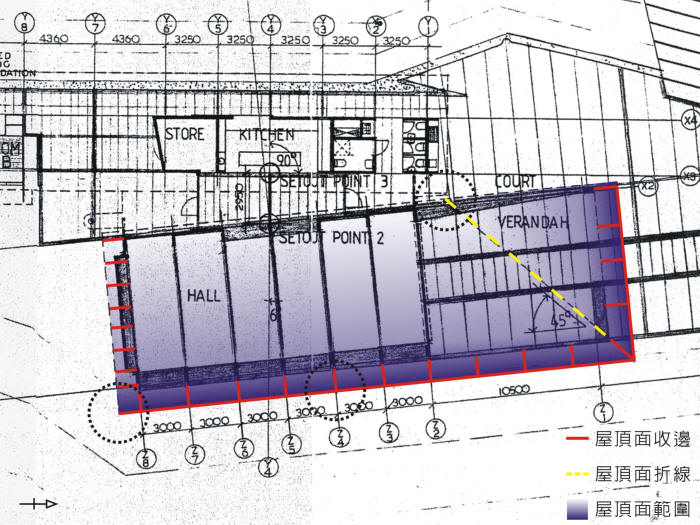 在屋頂面的東向及北向邊緣以鋼構件收邊,鋼構件並與主結構體的混凝土柱牆上部的鋼構件相接 |