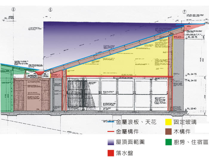 屋頂內部的主要結構為木框架(短向),以及C型鋼(長向),下接混凝土柱、牆上部的鋼構件,短向跨距約10米,長向跨距約30米,屋頂面由一條45°的折線分成兩部份,使屋頂面向西及向南傾斜向下,接至落水盤 |